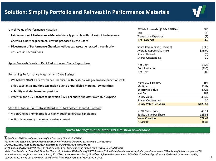 Ingevity (NGVT) — Vision One Management Partners (former Icahn protege) owned ~1% of NGVT shares and called for divestitures and a new CEO in February 2025. The upside math centered around: divestitures, buybacks, and a re-rating of the core Performance Materials business. The activist was targeting upside of $124 from a then share price of $46. (Link to my March 2025 write-up at $47.)