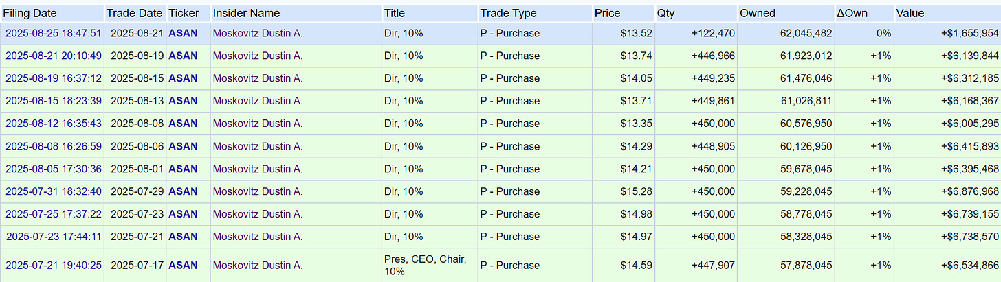 More frequent = weaker signal over time — If a CEO is consistently purchasing a bunch of stock over an entire year (or years), that signal gets weaker as it goes (see B. Riley and Asana below).