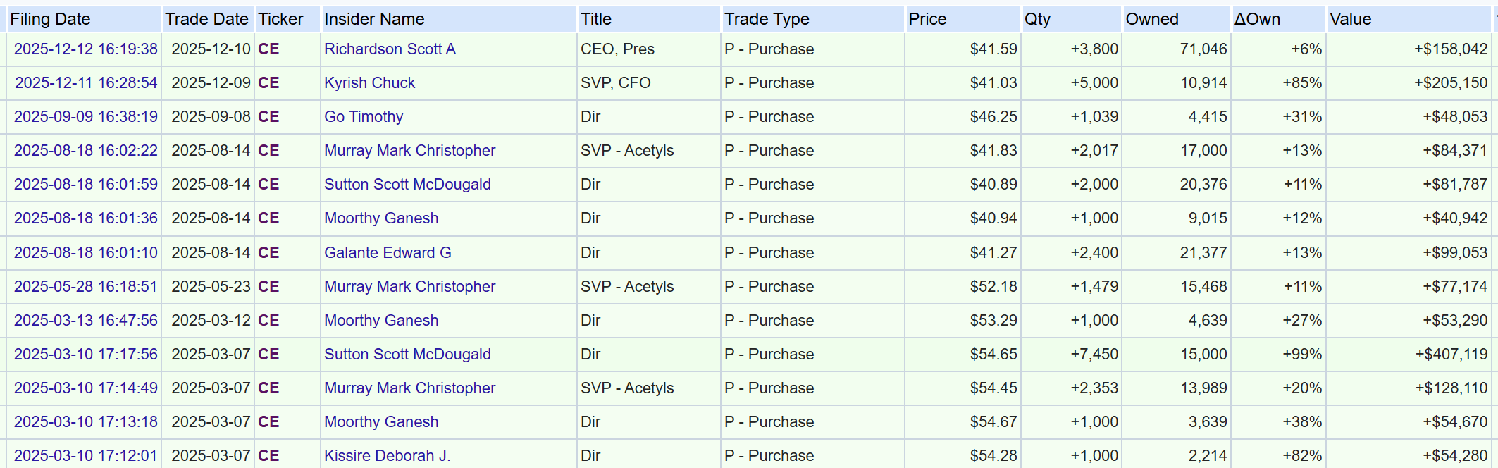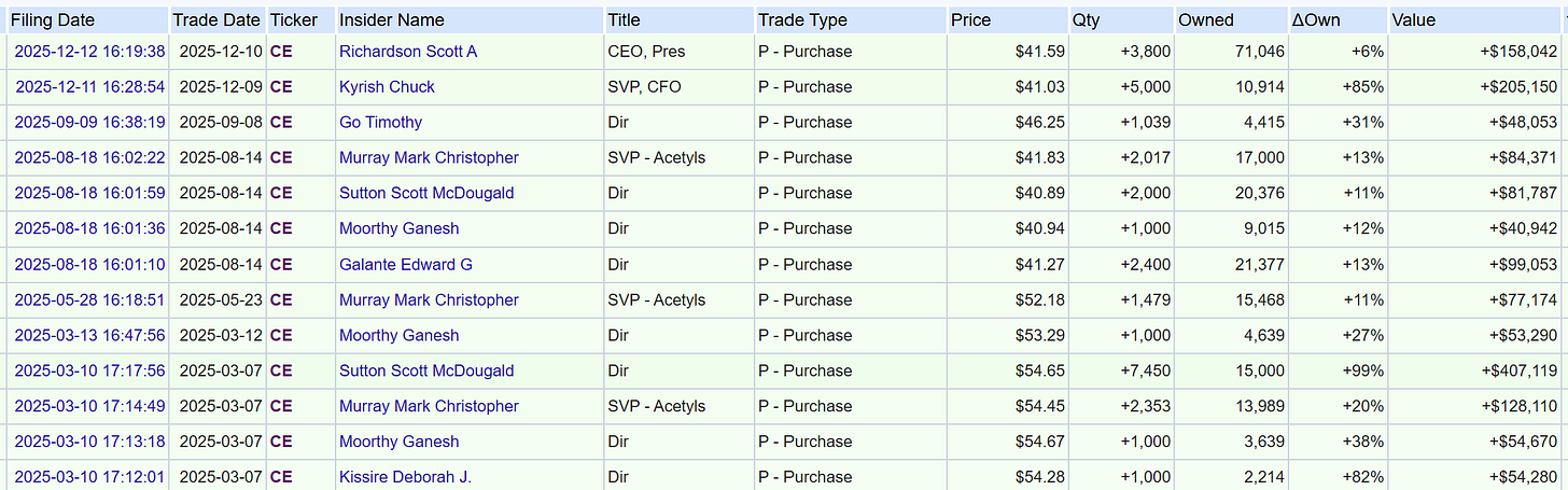 Celanese (CE, $44) — Celanese levered up to buy DuPont’s mobility & materials business in 2022 for $11bn. Shares fell from >$150 to $44 as they subsequently wrote off ~$3bn of the purchase. Analysts are expecting a return to growth in 2026 and shares are cheap (8x forward EPS) but highly levered (>5x leverage). Based on the buying activity below, maybe results are starting to bottom?