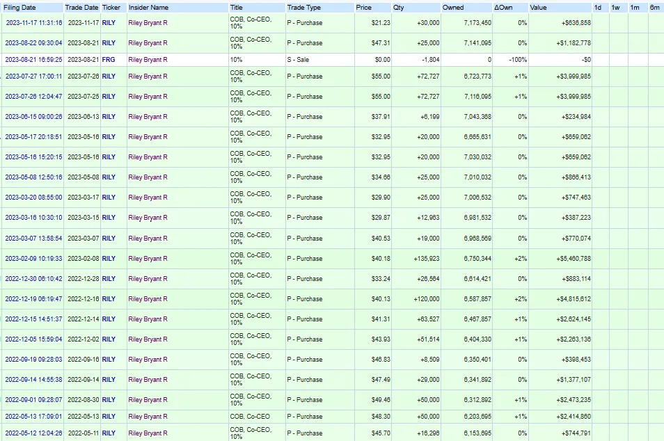 B Riley (RILY, $4) — Large and consistent insider buys are not an “automatic” buy signal. We still need to look at the fundamentals + outlook to make sure things are going well at the business. CEO Bryant Riley was consistently buying his own stock in large amounts for years. In hindsight, this should have lessened the “signal” over time.
