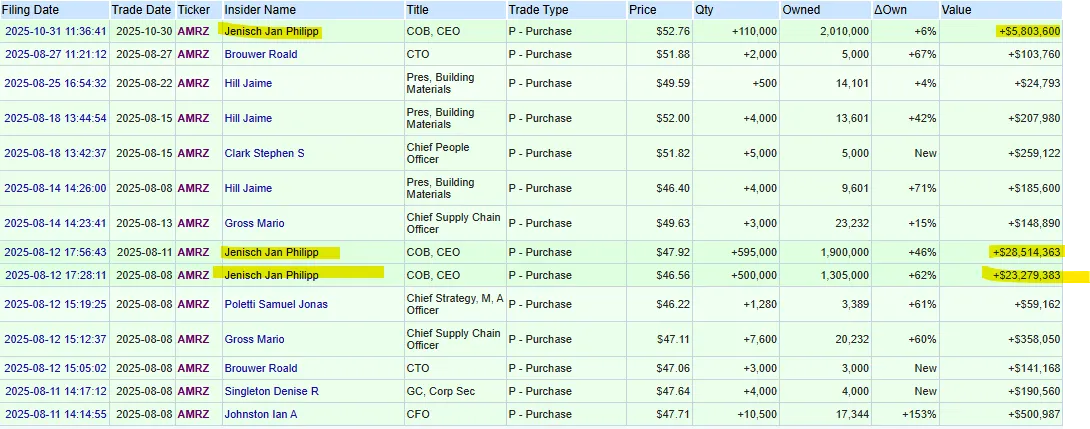 Amrize (AMRZ, $56) — The CEO of this June 2025 spin-off dropped $57.7m from August-October. This is >20x his 2024 base salary before the split from Holcim. Amrize trades at ~21x earnings and 11.8x EBITDA on 2025 guidance which might be reasonable for this cement + building products supplier.