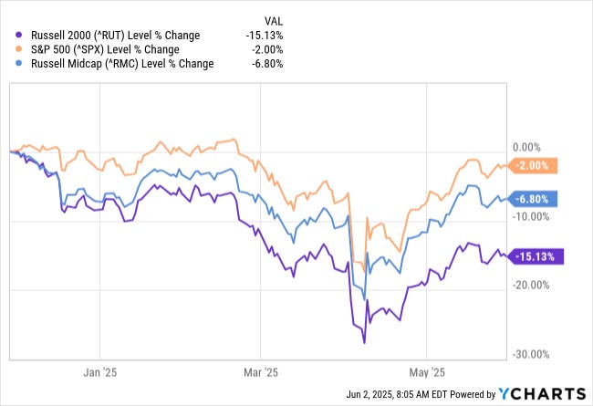 Small and mid cap stocks have been in a “bear market” for years now (relative to the S&P 500 at least). YTD 2025 has seen a widening of this trend. Translation? There are still plenty of opportunities in small and mid caps with the S&P 400/600 hanging around 14-16x earnings (vs. 20-22x for the S&P 500).