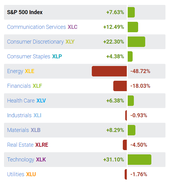 Year-to-date, most every sector is solidly in positive territory with the exception of energy, financials, real estate, and utilities…