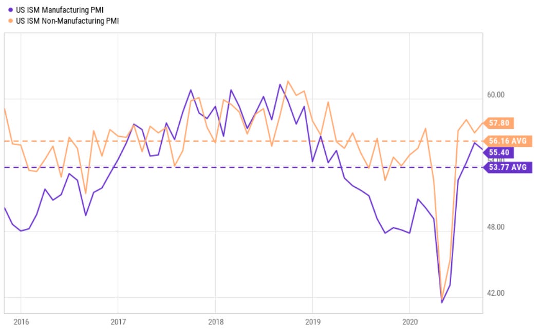 Economic activity as measured by the Purchasing Managers Index for both manufacturing and non-manufacturing sectors has and remains above 5-year averages…