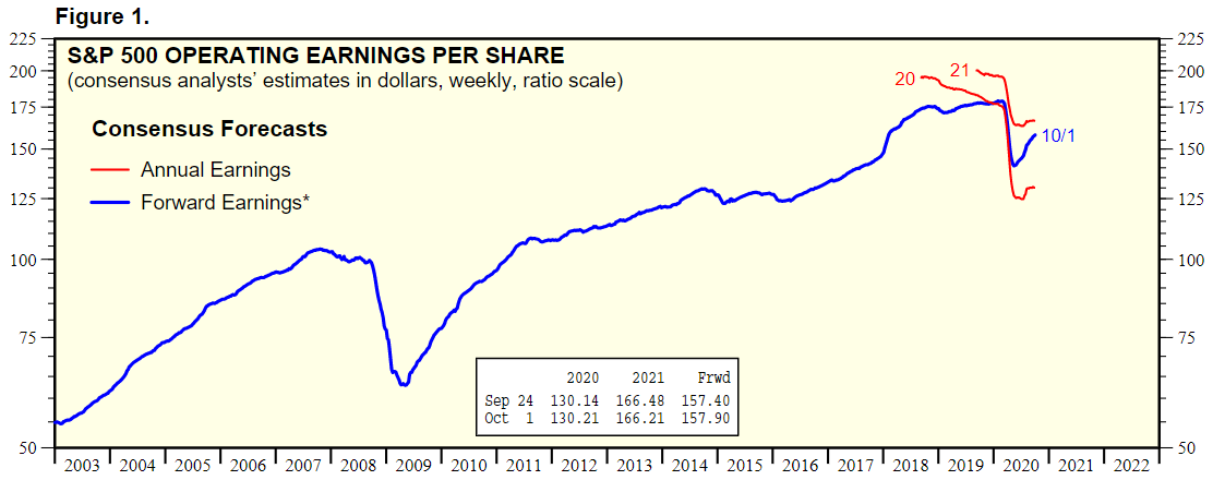 Based on the 166 estimates for 2021 from both FactSet and Yardeni, the S&P is currently trading at about 21x 2021 earnings. That’s an earnings yield of about 4.7% compared to a 10-year treasury yield at <1%.