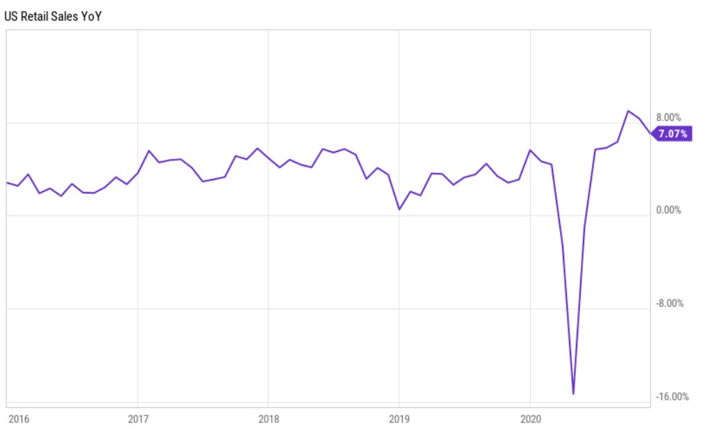 Year-over-year growth in retail sales is still much higher than past years — indicating continued strength in consumer spending.