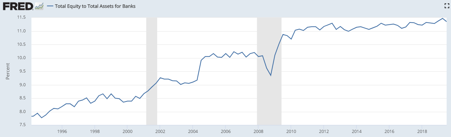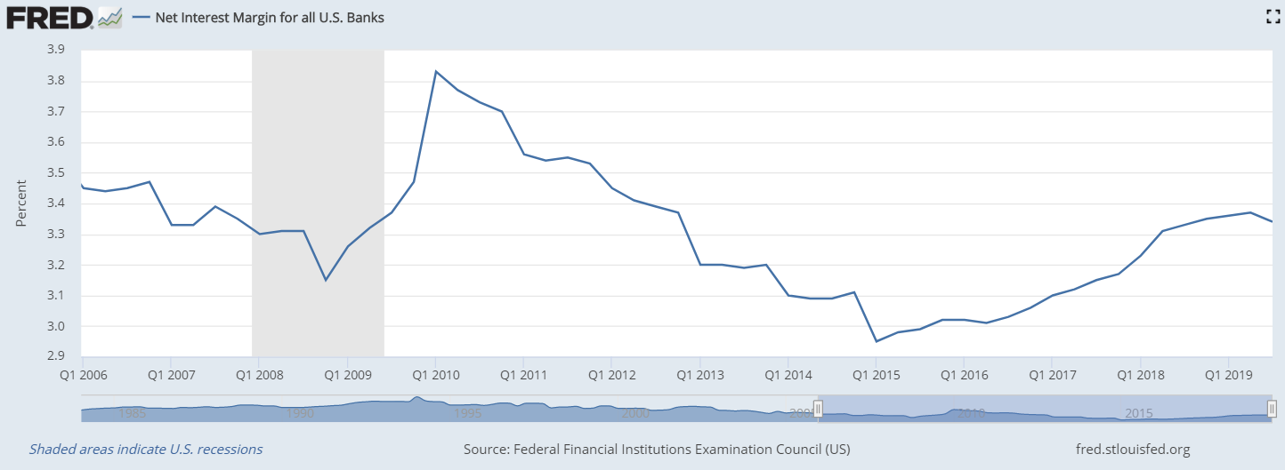 Bank lending is a key engine to economic growth. The series of charts below highlight Net Interest Margins, Loan Growth, and Equity to Assets at US banks.