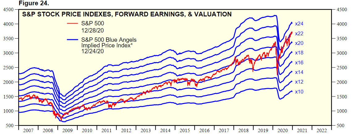 At a level of 3756 and operating earnings of $169 (estimated 2021) = 22x PE ratio. The blue angels chart below shows some serious multiple expansion over the last 10 years despite mostly flat earnings from the S&P (albeit 2018 saw a bump from tax reform).