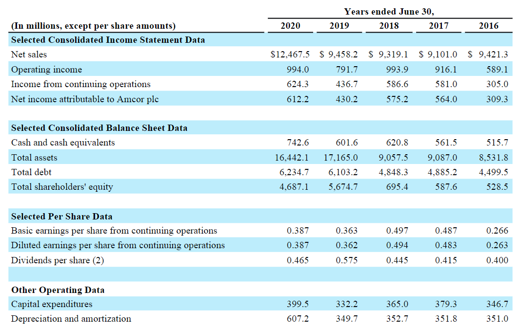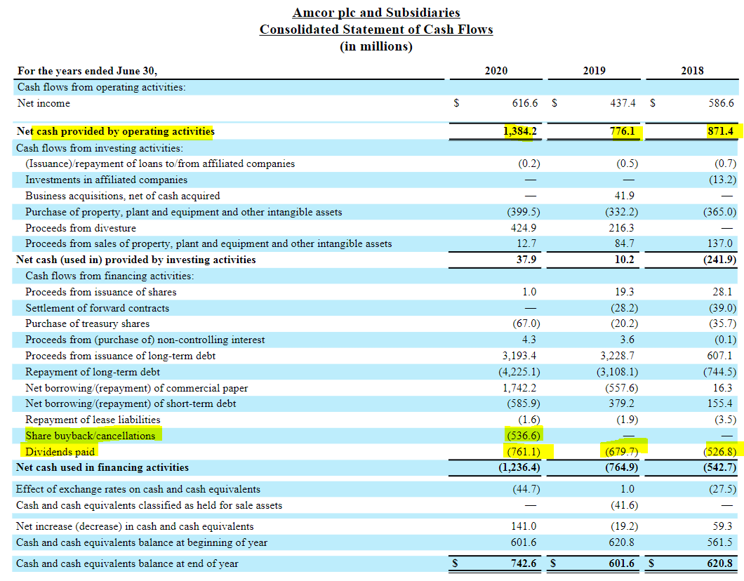 The plastics and packaging industry can be very lucrative from a cash generation standpoint (I’ve written about competitor Berry Global in the past). But there are also some organic growth tailwinds at play here. International / emerging market sales are significant at Amcor at >60% of revenue. Environmental considerations play in with recyclable materials. And COVID may reinvigorate the need for single use / disposable products.