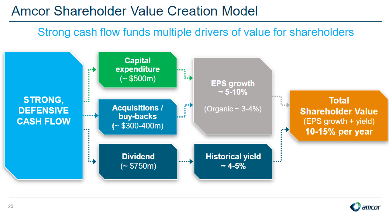 At $12/sh, Amcor is an $18bn company with a minor amount of net debt and ~$1.3-1.4bn in annual operating cash flow. Asset sales have helped to boost cash flow the psat 2 years and won’t last forever. The dividend is ~4% currently and as outlined above, the company hopes to see 5-10% earnings growth through capex, M&A, and buybacks.