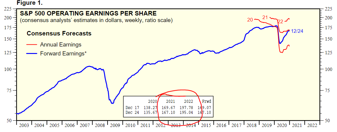 S&P earnings should finish 2020 down about 15% or so from $163 per share in 2019. Between FactSet and Yardeni, 2021 looks like ~$169 per share which is 3-4% higher than the 2019 level. Yardeni has an early 2022 prediction of $195 or 15% growth from 2021.