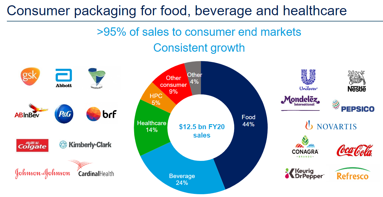 Amcor is a plastics packaging business making packages for snacks, beverage, pharma, and a variety of other consumer products.