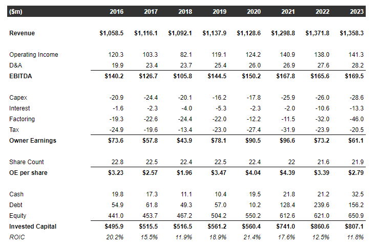 That’s a lot going on so here is a chart highlighting the fundamental picture from 2016-2023… Revenue, interest, and debt jumped in 2021 due to a large acquisition (~$125m). There’s a modest dividend but capital allocation is going toward debt repayment lately.