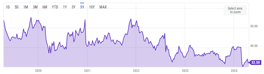 Management is guiding 2024 EBITDA flat from 2023 — $126m — backing out interest ($10m), capex ($25m) and 25% for taxes ($26m)… I get $65m in FCF or ~$3/share. Call it 11x P/FCF.