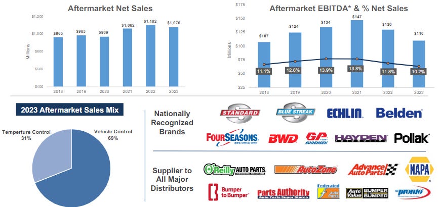 Aftermarket — $1.07bn 2023 sales. Includes both VC/TC segments. Sales mostly go to the auto parts retailers (AZO, ORLY, AAP, etc.) and those customers have been destocking inventory lately which hit 2022-2023 results.