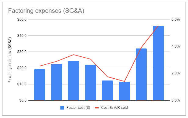 Factoring costs — SMP factors a large portion of receivables each year to expedite collections. In total they’re selling 60-70% of revenue annually and those costs have spiked thanks to higher interest rates. At $46m annually, this is running nearly $1.50/share after-tax! Much like debt on a balance sheet, this seems like a solvable problem…