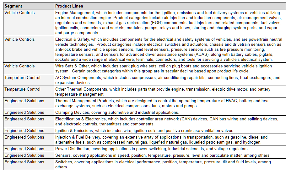 Think of it as an aftermarket parts business (both vehicle control and temperature control) plus an on/off-highway OEM parts business (engineered solutions):