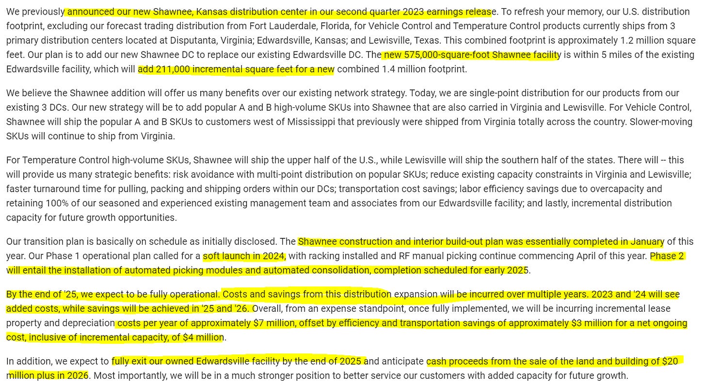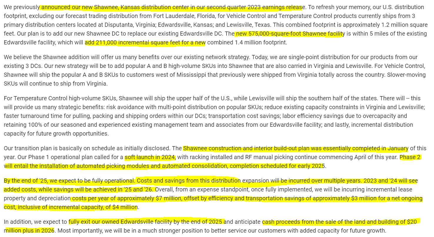 New distribution center — In 2023, SMP announced they would build a new distribution center to expand capacity and eventually close down and sell an older DC. The plan is to soft launch in 2024 with the new facility fully operational by end of 2025. The expense side of the equation is already being borne ($7m per year in opex + D&A) while cost savings won’t materialize until end of 2025 ($3m per year). That’s another $0.10/share after-tax to earnings just from the opex savings.