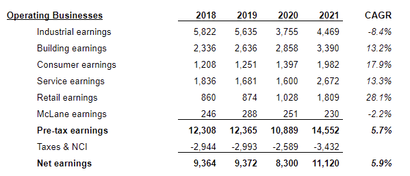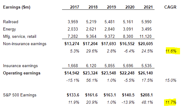 Excluding investment activity, operating earnings were ~$26bn in 2021 vs. $22.2bn in 2020 and $23.5bn in 2019. From 2017-2021 the non-insurance businesses grew earnings at an 11.6% CAGR vs. the S&P 500 growing earnings at a slightly better 11.7% per year.