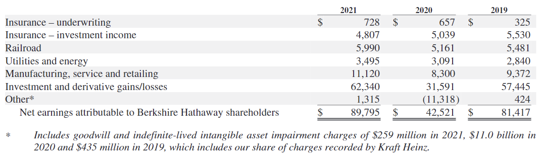 From the chart above, industrial earnings has a big contribution from Precision Castparts Corp which kicked in $1.2bn earnings up 78% from 2020. Lubrizol earnings were down 50% in 2021 (~$500m) and Marmon was up 40% (~$1.4bn).