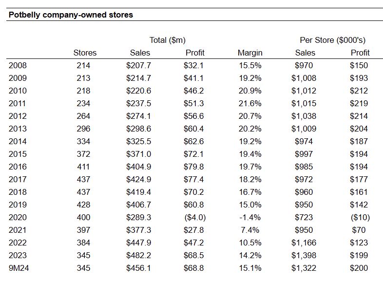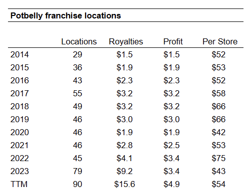 On the franchise side, Potbelly is up to 90 locations with the average store chipping in ~$54k of profitability to the parent company (though run-rate looks closer to $70k per franchised store).