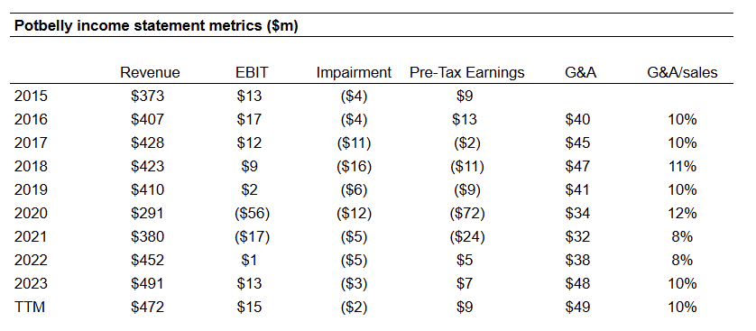 This is no longer a turnaround story — Store count peaked in 2017, from 2015-2023 they took $65m in impairment charges, pre-tax losses were $118m from 2017-2021, they raised $15m equity at low prices in 2021, and borrowed >$30m from 2020-2023. Yikes.