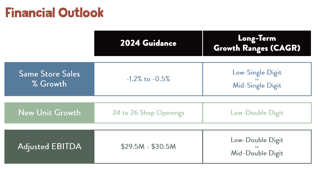 In 2024, Potbelly is guiding to $30m EBITDA and ~25 new store openings. 2025 should grow from there as store openings season for a year. Longer-term, they expect >10% annual EBITDA growth and 10+ new stores per year.
