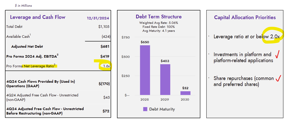 There are ~132m shares x $8 = $1.06bn market cap. Net debt should finish 2025 at $1.1bn with EBITDA and FCF at $350m and $175m each. That’s 6.2x EBITDA and 6.1x FCF with peers at >20x earnings.
