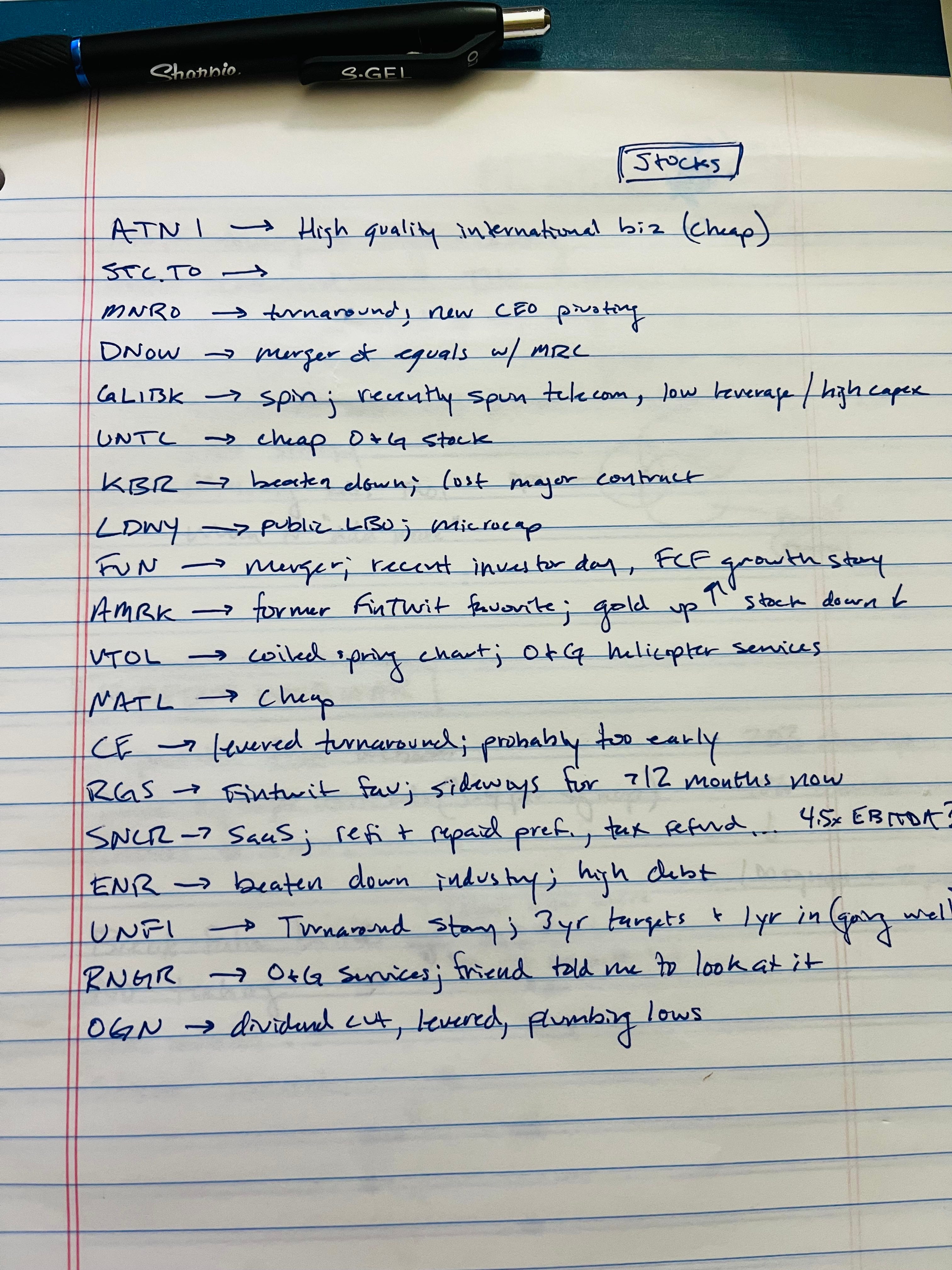 Every month or so, I cobble together a list of ideas sourced from Twitter/X, Substack blogs, articles, papers, and other sources; then I work the list one-by-one. I keep a notepad on my desk and when something catches my eye, I’ll write down the ticker and a one-liner noting the idea “theme” and what makes it interesting.