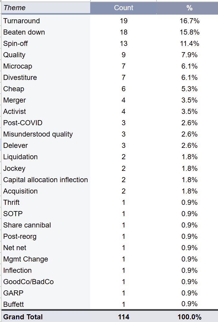 Theme — This is my “pattern recognition” component (i.e. spin, merger, beaten down, turnaround, etc.). Here’s what it looks like in aggregate: