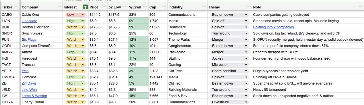 It’s a semi-formal and semi-permanent tracker for stocks I’m following. Usually, an idea lands here when I like the combination of valuation, theme, and catalyst; but haven’t done enough work on the industry, peers, history, or how the idea stacks up against existing holdings.