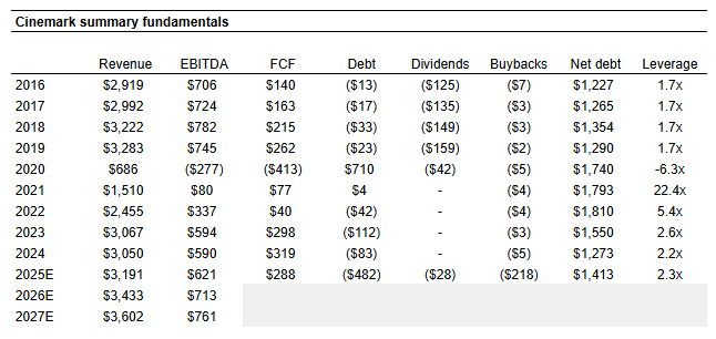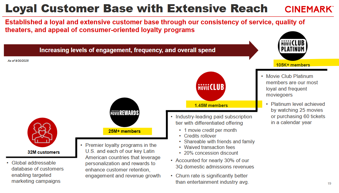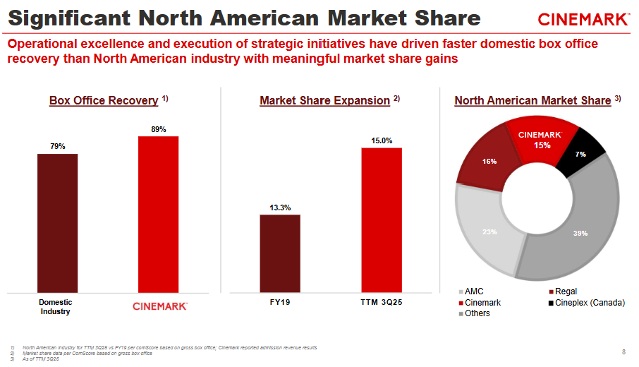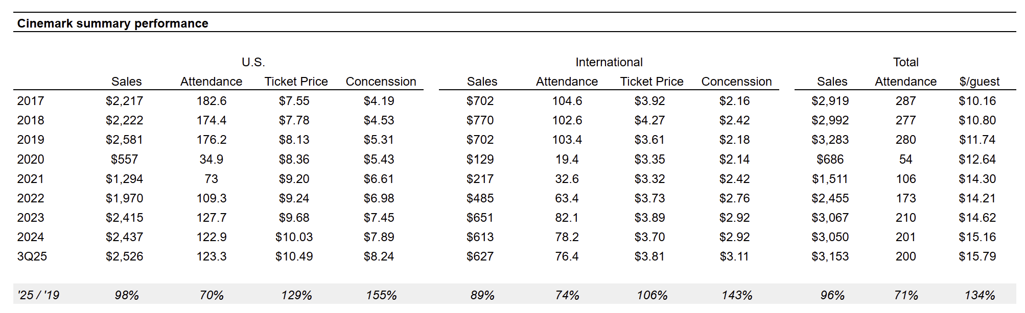 Total attendance for Cinemark theaters was 200m as of 3Q25 (TTM) compared to 280m in FY2019 (i.e. ~72% of pre-COVID levels).