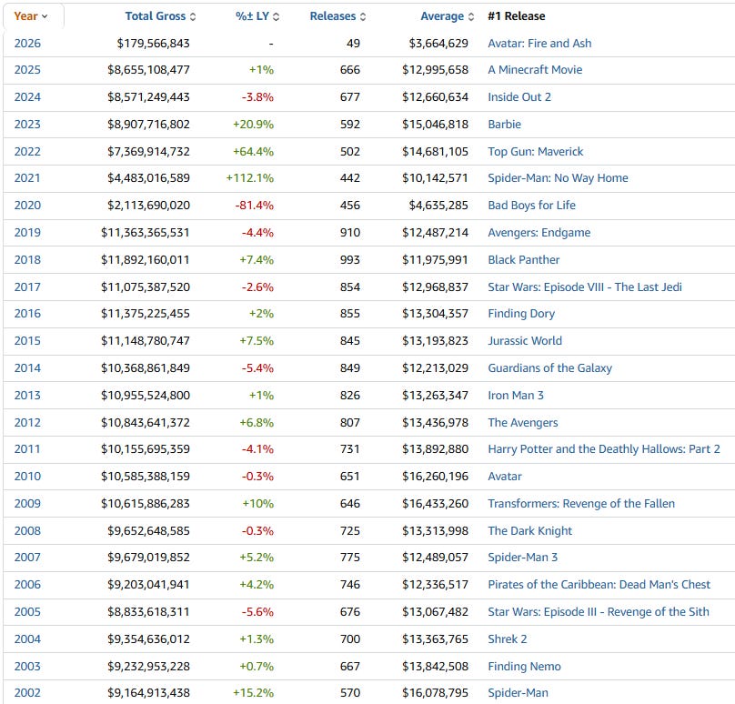 Industry results were severely impacted in 2024 (and to some extent 2025) from Hollywood writers and actors strikes. This had a delayed impact on production and film releases which has analysts excited about the potential for 2026 box office performance (most estimates are +10%).
