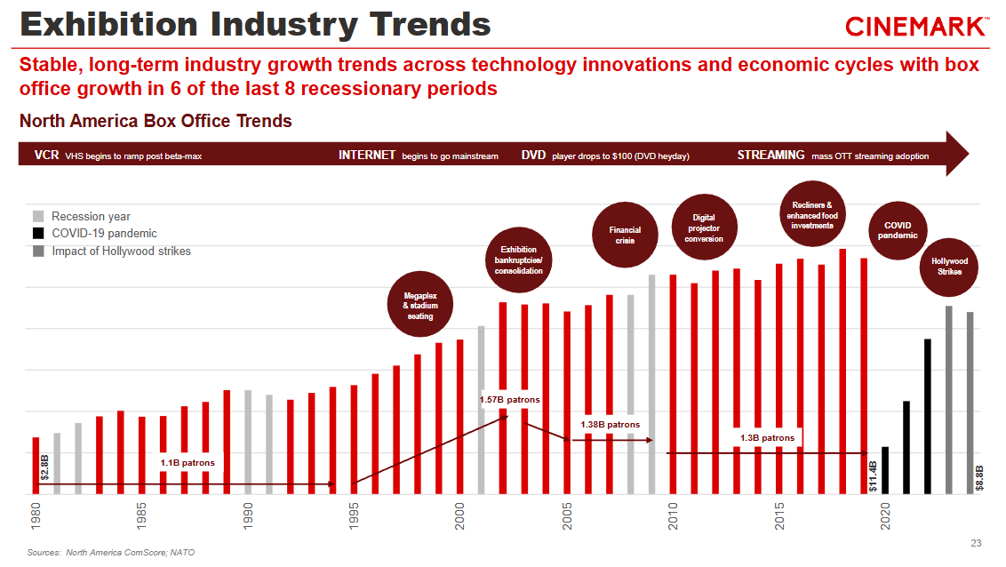 Movie theaters are driven largely by the number of film releases each year and the success of those films (box office). It’s an industry that was significantly impacted by COVID and again from 2023 Hollywood writer strikes.