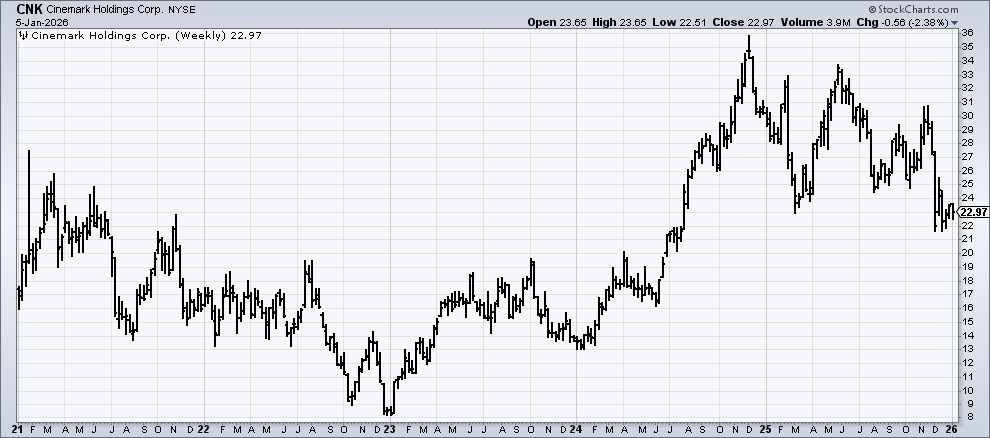 Theme: beaten downShares of media companies were selling off hard leading up to the announcement of the Netflix/Warner acquisition which fits my theme of looking at beaten down stocks. Cinemark was trading at $30+ in November and now sits at $23.