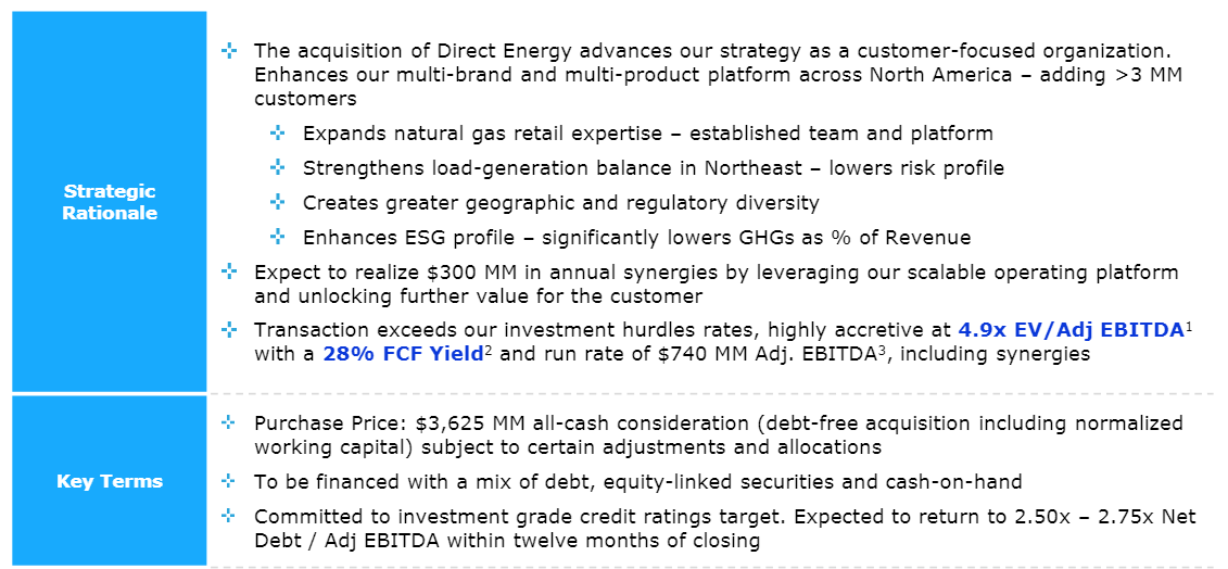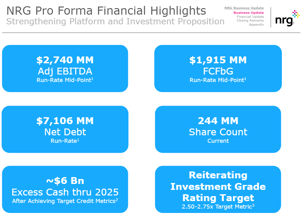 In mid-July 2020, at the time of the Direct Energy announcement, NRG was highlighting the following metrics after realizing synergies from the deal. (Note: FCFbG indicates free cash flow before growth investments.)