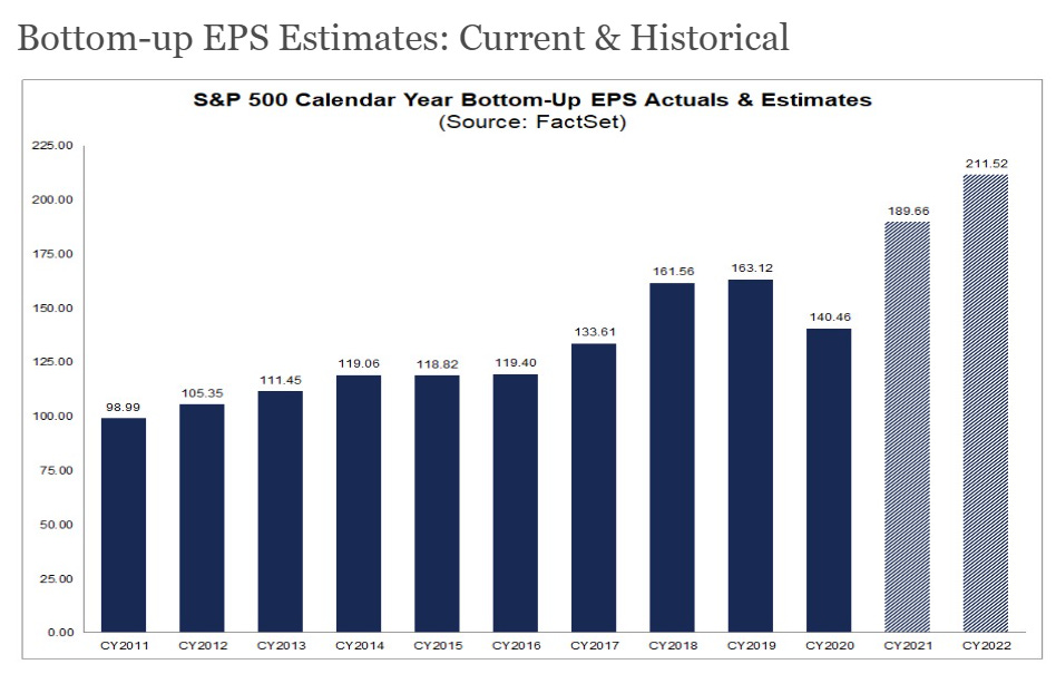 If 2022 estimates for S&P 500 earnings become accurate (or low), then earnings growth would be 9% per year or better from 2019 — absent any knowledge of COVID, most investors would be quite happy with this result!